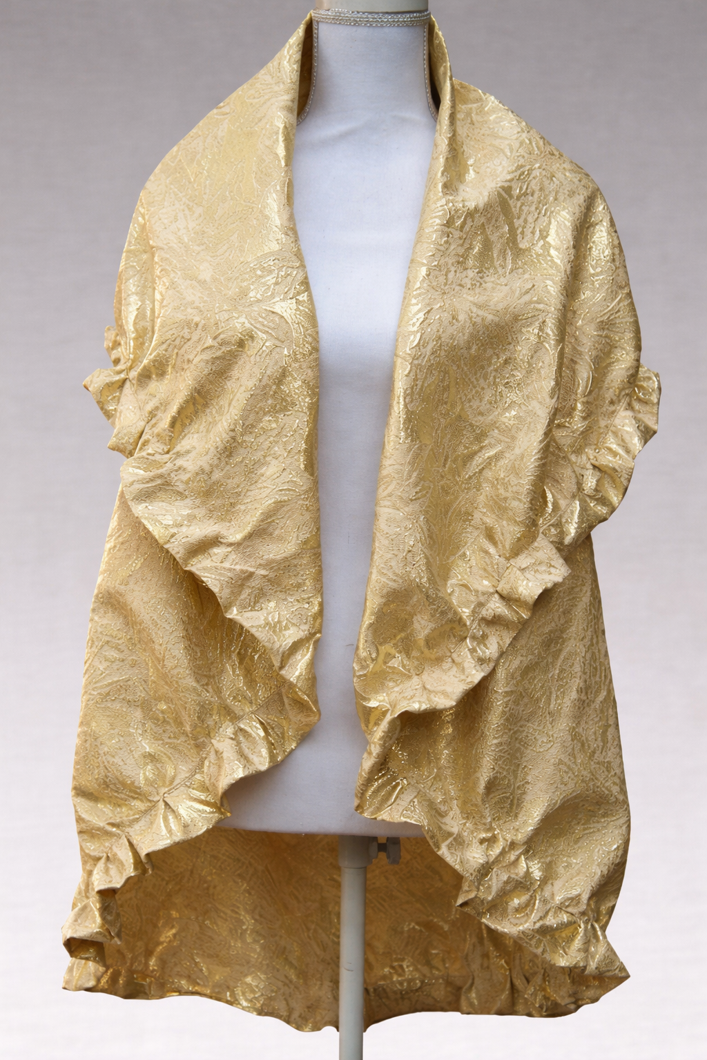 Gold Leaf Cape Gold Leaf shawl/cape $349 Only 1 available Overview Handmade item Description: Round, embossed, beige and gold cape/shawl. Reversible 4 in 1. Ships from Atlanta, Georgia.